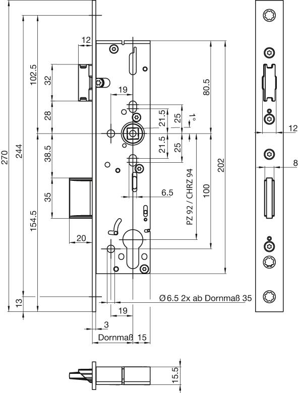 PZ-gelocht Entfernung: 92 mm Drückernuss: 9 mm Stulpausführung: 24 x 270 x 3 mm, Flachstulp kantig Ohne Wechsel Stulp Edelstahl Schlossriegel: 1 tourig Funktion Anti Panik: Umschaltfunktion B Fallenausschluss: 12 mm Riegelausschluss: 20 mm Norm: DIN 18250, DIN EN 179, DIN EN 1125