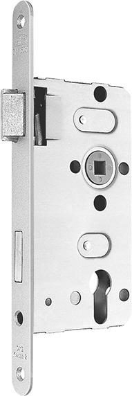 Nach DIN 18251, Klasse 2 für gefälzte Türen 2 tourig Dornmaß: 55 mm Entfernung: 72 mm Nuss, Kunststoff: 8 mm Falle und Riegel aus Zinkdruckguss Mit Wechsel Ohne Schließblech Stulp: silberfarbig lackiert PZ