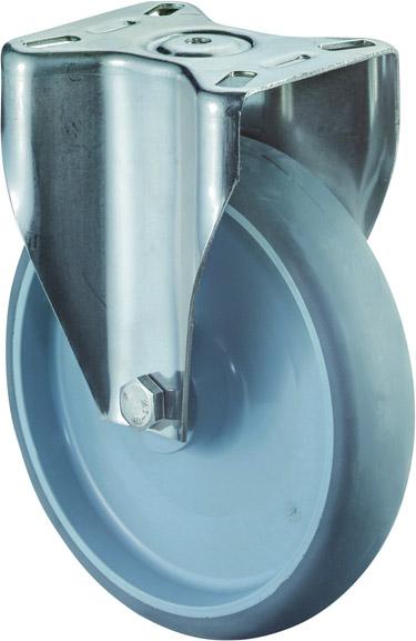 Gehäuse: Edelstahl, zweireihiger Kugelkranz im Gabelkopf Lauffläche: thermoplastisch, Reifen grau Radkörper: Kunststoff Lager: Gleitlager