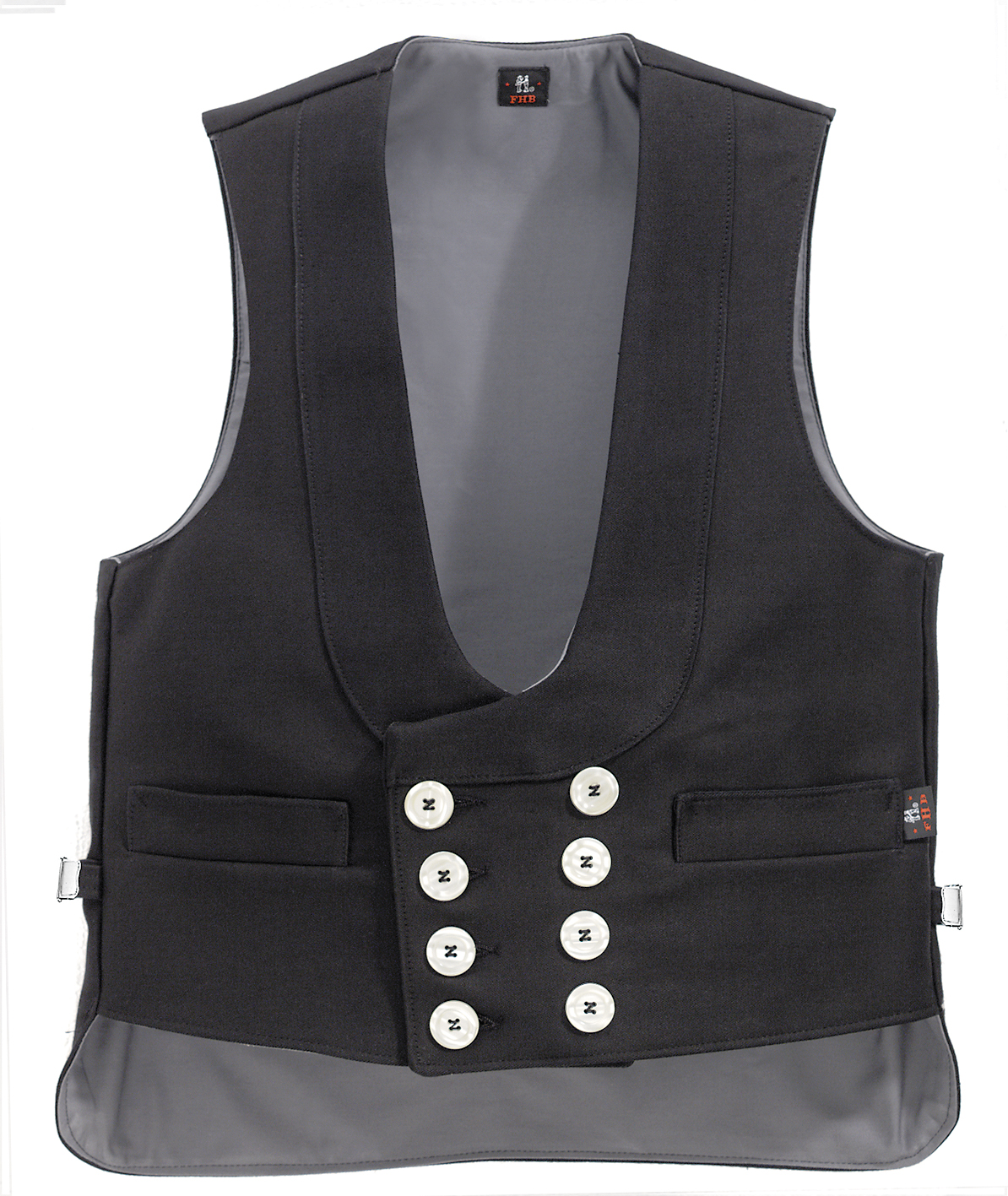 FHB JAKOB Zunftweste, Zwirn-Doppel-Pilot, Nierenschutz, zweireihig, achtknöpfig, 2 Außentaschen, 1 Innentasche mit Klett, Perlmuttimitatknöpfe, Rückenteil aus der gleichen Qualität wie Vorderteil, 2 Rückenschnallgurte