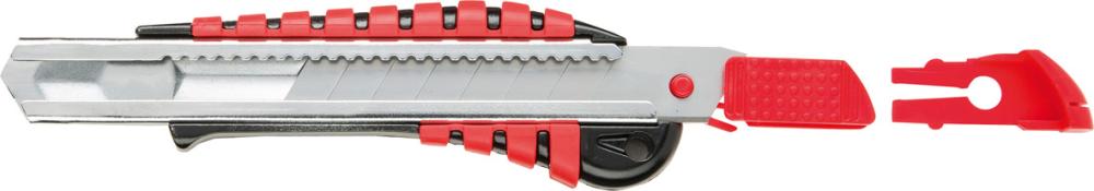 Ausführung: Gehäuse aus Zink-Druckguss mit Gummieinlage, Metall-Klingenführung und Klingendepot. Fixierung der Klinge durch Drucktaste. Lieferung mit 1 Abbrechklinge.