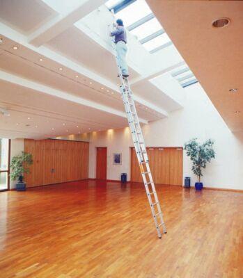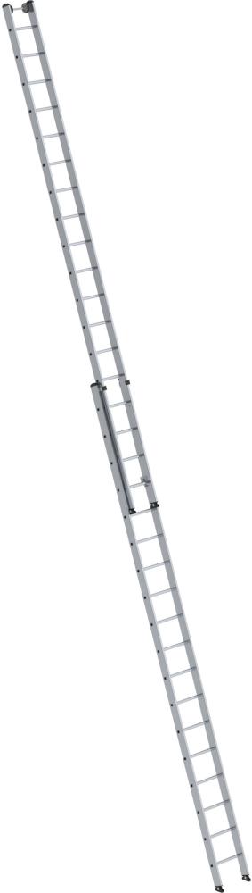 Aluminium-Schiebeleiter, 2-teilig Besonders standsicherDurch nivello®-Leiterschuhe, stabile Rechteckholme, korrosionsbeständige Führungsbeschläge, dauerhaft verbördelte, geriffelte Vierkantsprossen (30x30 mm) und Steckhaken mit automatisch einrastender Abhebesicherung. Sprossenweise höhenverstellbarOberleiter per Hand von Sprosse zu Sprosse verstellbar.Verstellung über integriertes Kunststoffseil. Flexibel einsetzbarBeide Leiterteile auch einzeln als Anlegeleiter verwendbar, ab 2x14 Sprossen mit Oberleiter inkl. Wandlaufrollen. IndustrieausführungBauart-geprüft, entspricht DIN EN 131, BetrSichV, TRBS 2121, DGUV Information 208-016 bzw. 208-017 und geltendem DGUV Regelwerk.