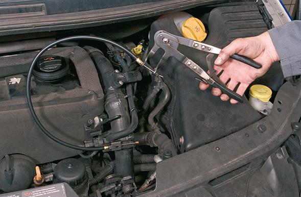 Schlauchklemmen-Zange mit semiflexiblem Bowdenzug, für Federband- und Raumsparschellen