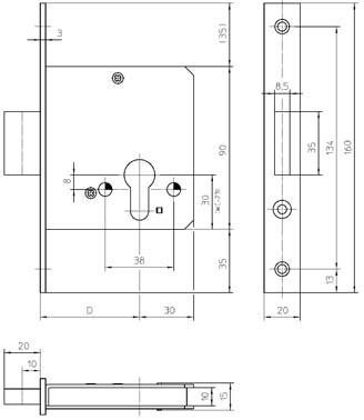 KFV ZT-Einsteckriegelschloss,PZ,D55,20kt,DL/DR