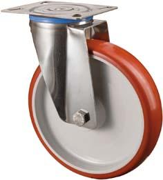 Gehäuse: Edelstahl, zweireihiger Kugelkranz im Gabelkopf Lauffläche: Polyurethan rot, 98 ± 4 Shore A Radkörper: Kunststoff Lager: Gleitlager