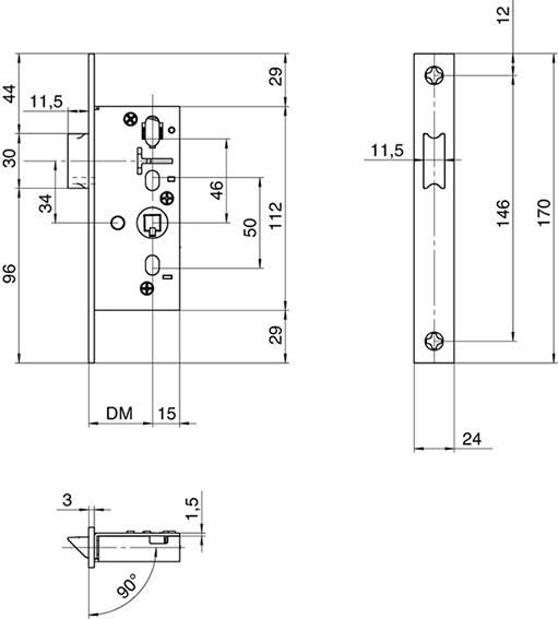 Fallenschloss nach DIN 18251-2 Klasse 3, kurze Ausführung, Schlosskastenlänge 112 mm, Falle vernickelt, Falle umlegbar rechts/links verwendbar, Schlosskasten oben und unten geschlossen, verzinkt, mit 8-mm-Klemmnuss, mit Späneschutzhülsen, mit durchgehenden Beschlagsbohrungen ober-/unterhalb der Schlossnuss, Stulp 24 x 170 mm, kantig, Edelstahl fein geschliffen.