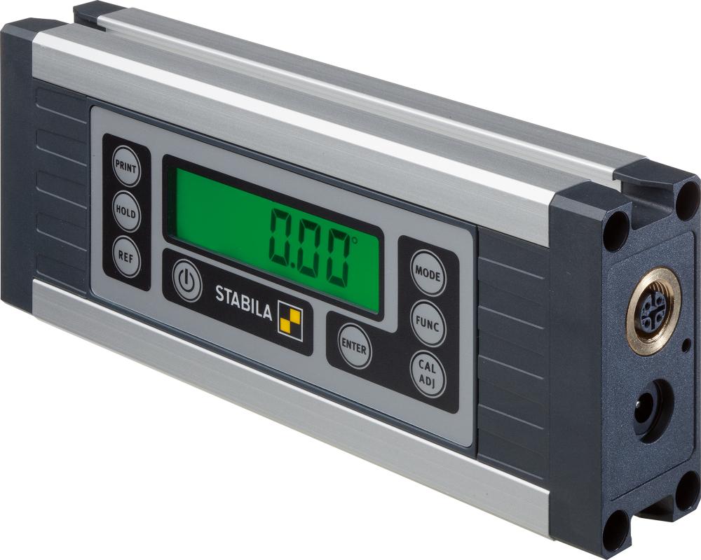 Ausführung: Elektronischer Neigungsmesser mit eloxierten Messflächen mit variable Befestigungsmöglichkeiten mit T-Nut, V-Nut und Seltenerd-Magnetsystem. Akustische Zielführung zum schnellen Ausrichten. Anzeige in °, %, mm/m, in/ft dezimal und als Bruch. Mit RS-485-Schnittstelle zum Übertragen der Messwerte. Messgenauigkeit: 0°, 90°, 180° und 270°: ± 0,05°, dazwischen ± 0,1°. Funktionen: Ein- und automatische Abschaltung, REF zur schnellen Messung im Bezug auf einen Referenzwinkel, HOLD speichert den gemessenen Wert, PRINT zum Messen nach Tastendruck, AUTO zum Messen nach jeder Anfrage. Lieferumfang: Neigungsmesser mit Li-Ion-Akku, Schutztasche, Netzteil inkl. 4 länderspezifischen Wechseladaptern, 4-poliges Datenkabel, USB-Datenkabel und Auswertesoftware STABILA ANALYTICS.