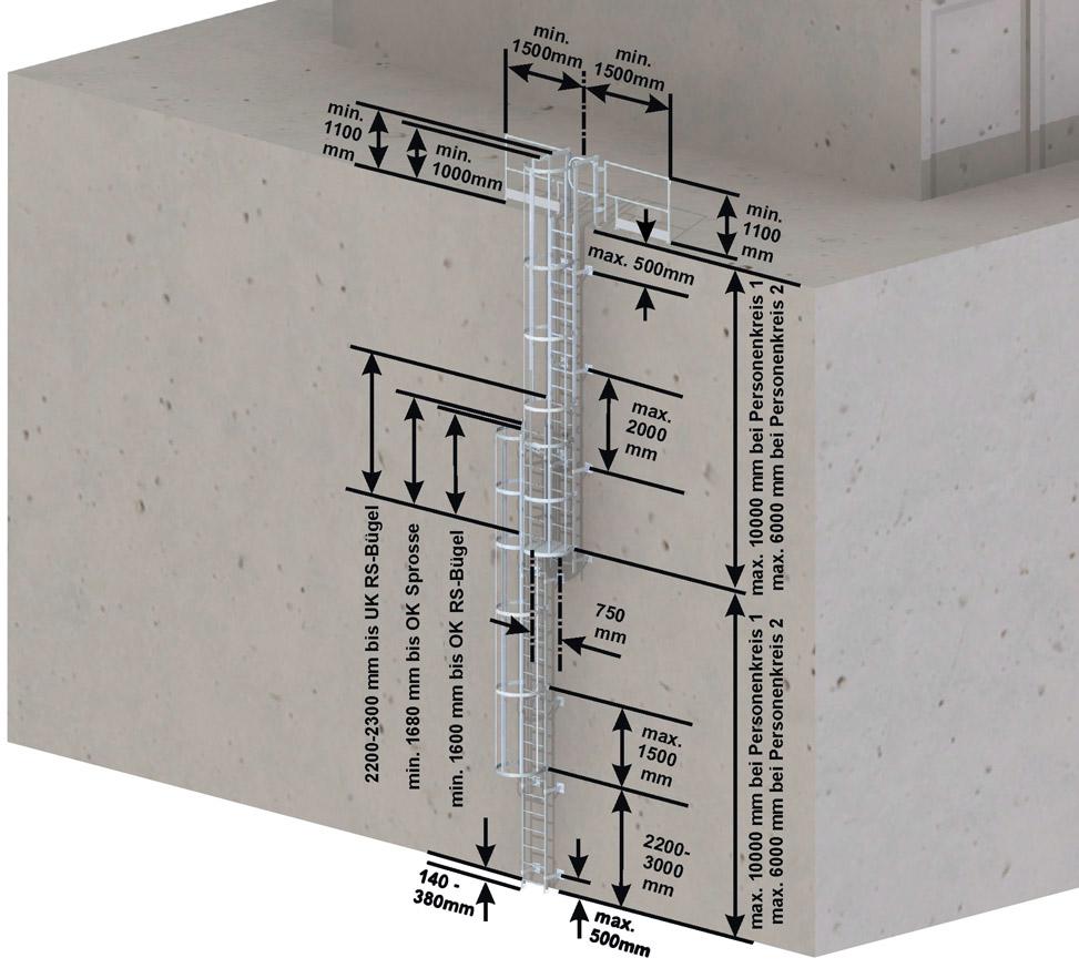 Steigleitern sind immer dann Ihre passende Steigtechniklösung, wenn Gebäude, Anlagen oder Maschinen einen dauerhaften Zugang erfordern. Sie sind robust, langlebug, efizient und erlauben einen sicheren Auf- und Abstieg. Auch bei großen Höhen. Podeste gestatten Ruhepausen und den einfachen Umstieg bei versetzt angebrachten Steigleitern. Ein umfangreiches Zubehörsortiment deckt die vielfältigtsten Anforderungen ab, die die baulichen Gegebenheiten mitunter verlangen. Das optimierte Montagesystem ermöglicht jetzt mit bis zu 30 % Zeitersparnis zu montieren. Auf Wunsch vermitteln wir Ihnen die Montage durch Fachbetriebe. Je nach Begebenheit und Einsatzzweck sind für die Ausführung von Steigleitern unterschiedliche Normen gültig. DIN 18799-1: Ortsfeste Steigleitern an baulicher Anlage Geltungsbereich: an Gebäuden für Wartungs- und Reinigungsarbeiten (für Schornsteine gelten besondere Vorschriften) Steigleitern nach DIN 18799-1 umfasst die Tabelle auf der nächsten Seite. Die Höhe der einzelnen Leiternzüge sowie Abstände von Ruhebühnen erfolgt unter Berücksichtigung der Personenkreise 1 und 2. Personenkreis 1 Personen mit Erfahrung in der Benutzung Personenkreis 2 Personen ohne Erfahrung in der Benutzung DIN 14094-1: Notleiteranlage Geltungsbereich: Notleiteranlagen sind bauliche Anlagen über die Menschen im Gefahrenfall gerettet werden können. Sie sollten grundsätzlich auch eine Selbstrettung ermöglichen. Bitte senden Sie uns dazu Ihre Anfrage. EN ISO 14122-4: Ortsfeste Steigleiter an maschinellen Anlagen Geltungsbereich: als Zugang zu stationären und mobilen Maschinen und maschinellen Anlagen. Dabei kann es sich auch um ein Gebäude als Teile einer maschinellen Anlage handeln. Bitte senden Sie uns Ihre Anfrage. Bei Personengruppe (2) = Die maximale Höhe der einzelnen Leiterabschnitte beträgt 6 m. Steigleitern erhalten Sie in vier Materialausführungen, passend zum Einsatzzweck: Aluminium blank speziell für Innenbereiche Aluminium farblos eloxiert speziell für ansprechende Optik im Außenbereich Stahl verzinkt robuste Ausführung für Industrie im Innen- und Außenbereich Edelstahl V4A (1.4571) wenn es auf Hygiene oder auf Korrosionsbeständigkeit ankommt Wir beraten Sie gerne, wenn es um besondere Gegebenheiten geht.