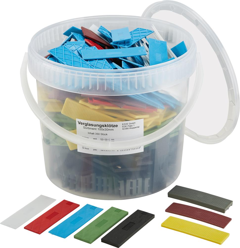 Für alle Arten von Verglasungsarbeiten Zum kurzzeitigen unterlegen bei Montagearbeiten Lieferung: Im Kunststoffeimer. Inhalt: 50 Stück, 100 x 30 x 1 mm, weiß 50 Stück, 100 x 30 x 2 mm, blau 50 Stück, 100 x 30 x 3 mm, rot 50 Stück, 100 x 30 x 4 mm, gelb 50 Stück, 100 x 30 x 5 mm, grün 50 Stück, 100 x 30 x 6 mm, schwarz 50 Stück, 100 x 30 x 8 mm, grau